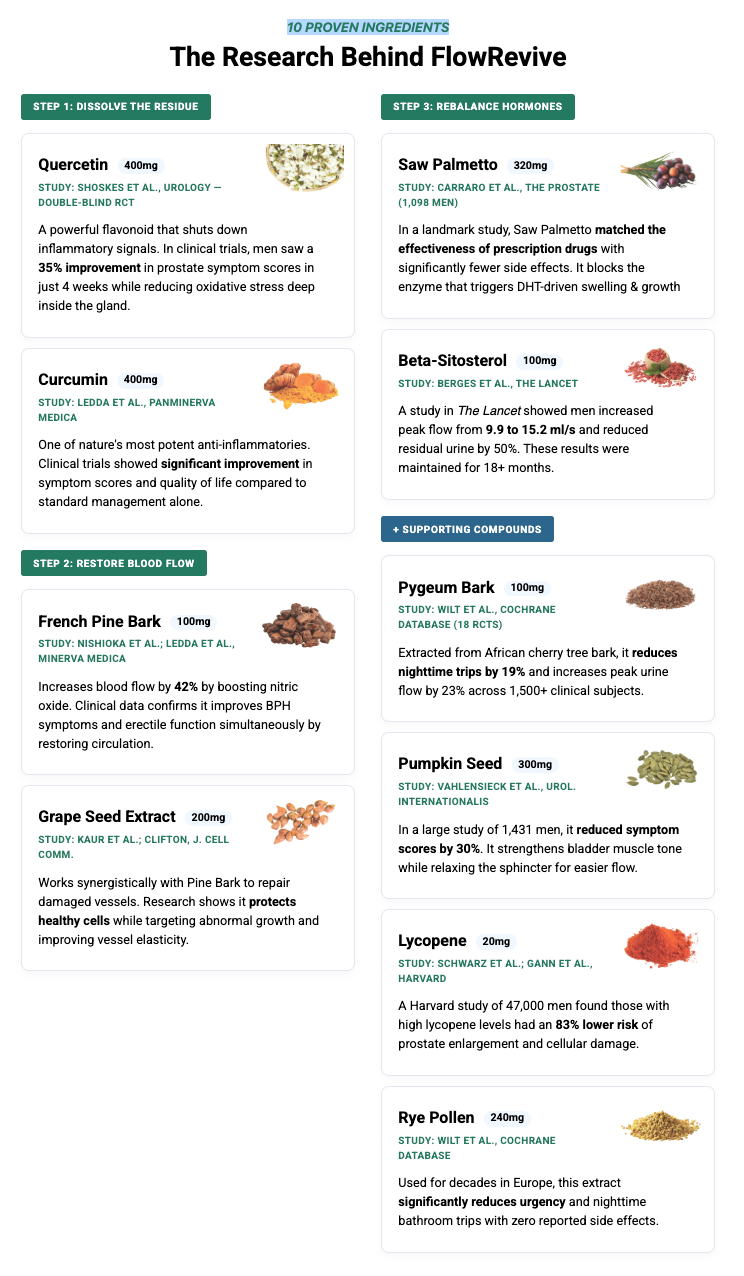 Most prostate supplements only contain one or two ingredients at doses far below what clinical studies show is effective. They're not addressing the real problem.
